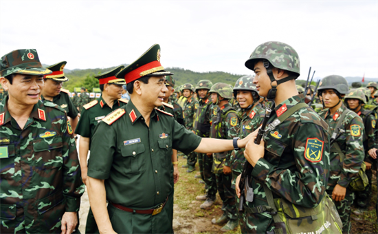 | Gen. Phan Van Giang, Minister of National Defence encourages troops during a live-fire exercise (photo: qdnd.vn) |