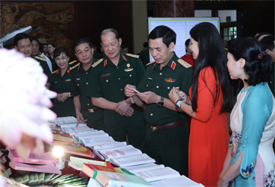 | Gen. Phan Van Giang visits exhibition booths of typical units in implementing Directive 05 (photo: mod.gov.vn) |