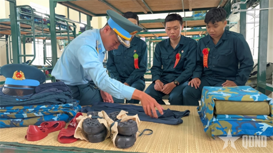 | Giving guidance on arranging personal military kit to new soldiers (photo: qdnd.vn) |