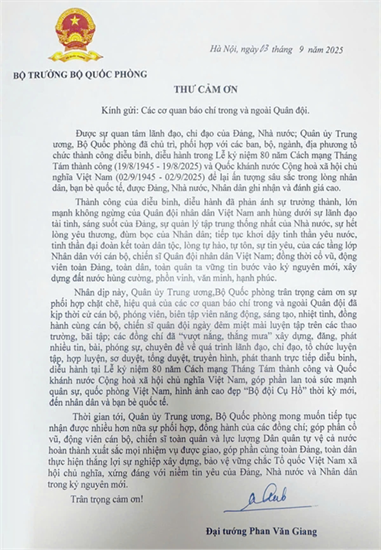 LTS: Ngày 3/9, Đại tướng Phan Văn Giang, Ủy viên Bộ Chính trị, Phó Bí thư Quân ủy Trung ương, Bộ trưởng Bộ Quốc phòng đã gửi thư cảm ơn các cơ quan báo chí trong và ngoài Quân đội vì đã có sự phối hợp chặt chẽ, hiệu quả trong tuyên truyền về quá trình luyện tập, hợp luyện, diễu binh, diễu hành tại Lễ kỷ niệm 80 năm Cách mạng Tháng Tám và Quốc khánh 2/9. Tạp chí Quốc phòng toàn dân điện tử trân trọng đăng toàn văn Thư cảm ơn của Bộ trưởng Phan Văn Giang: