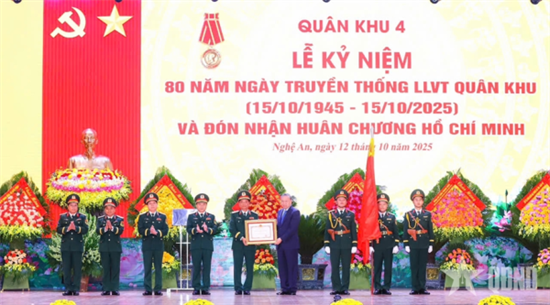 Sáng 12/10, Đảng ủy, Bộ Tư lệnh Quân khu 4 tổ chức Lễ kỷ niệm 80 năm Ngày truyền thống Lực lượng vũ trang (LLVT) Quân khu (15/10/1945 - 15/10/2025) và đón nhận Huân chương Hồ Chí Minh. Tổng Bí thư Tô Lâm, Bí thư Quân ủy Trung ương dự và phát biểu tại Lễ kỷ niệm.