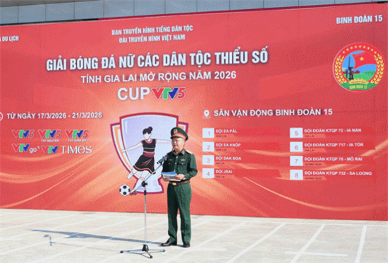 Sáng 17/3, tại Binh đoàn 15 (phường Thống Nhất, tỉnh Gia Lai), Giải bóng đá nữ các dân tộc thiểu số tỉnh Gia Lai mở rộng năm 2026 - Cúp VTV5 chính thức khai mạc. Giải đấu do Ban Truyền hình tiếng dân tộc - Đài Truyền hình Việt Nam (VTV5), Sở Văn hóa, Thể thao và Du lịch tỉnh Gia Lai và Binh đoàn 15 (Bộ Quốc phòng) đồng hành, phối hợp tổ chức.