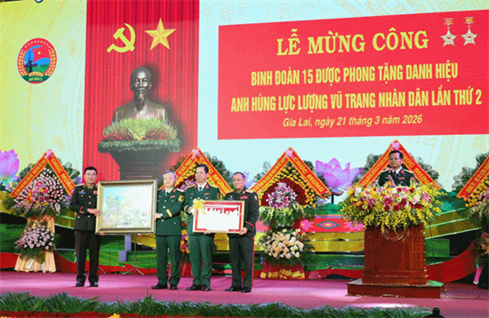 Sáng 21/3, tại Gia Lai, Binh đoàn 15 long trọng tổ chức Lễ mừng công nhân dịp Đơn vị vinh dự được Đảng, Nhà nước phong tặng danh hiệu Anh hùng Lực lượng vũ trang nhân dân lần thứ hai.