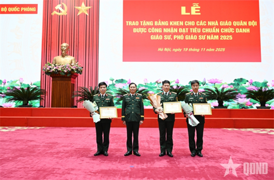 Chiều 19/11, Bộ Quốc phòng tổ chức Lễ trao tặng bằng khen cho các nhà giáo Quân đội được công nhận đạt tiêu chuẩn chức danh giáo sư (GS), phó giáo sư (PGS) năm 2025. Đại tướng Nguyễn Tân Cương, Ủy viên Trung ương Đảng, Ủy viên Thường vụ Quân ủy Trung ương, Tổng Tham mưu trưởng Quân đội nhân dân (QĐND) Việt Nam, Thứ trưởng Bộ Quốc phòng chủ trì buổi lễ.
