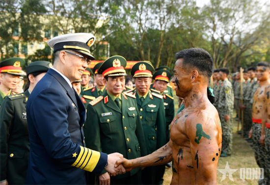 Nhân dịp này, Đại tướng Phan Văn Giang và Thượng tướng Đổng Quân cùng các đại biểu tham quan trình diễn các kỹ thuật Đặc công theo kịch bản được xây dựng công phu và đặc sắc tại thao trường. Các cán bộ, chiến sĩ Lữ đoàn Đặc công bộ 113 đã trình diễn một số kỹ thuật ngụy trang, bắn các loại súng có trong biên chế, trình diễn võ chiến đấu đặc công và kỹ thuật công phá, v.v. Mở đầu màn trình diễn là màn bắn chào mừng hiện chữ “Nhiệt liệt chào mừng đồng chí Thượng tướng Đổng Quân, Bộ trưởng Bộ Quốc phòng nước Cộng hòa nhân dân Trung Hoa thăm đơn vị” và 16 lá cờ chiến thắng bố trí 2 bên hàng chữ. Tiếp theo là các màn trình diễn kỹ thuật bắn súng, nhào lộn qua vòng lửa, đánh quyền, dao, côn, võ tổng hợp,…