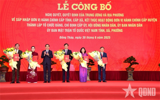 Sáng 30/6, tỉnh Đồng Tháp tổ chức Lễ công bố các nghị quyết, quyết định của Trung ương và địa phương về sáp nhập đơn vị hành chính cấp tỉnh, cấp xã; kết thúc hoạt động đơn vị hành chính cấp huyện, thành lập tổ chức đảng, chỉ định cấp ủy, HĐND, UBND, MTTQ tỉnh, xã, phường. Đại tướng Phan Văn Giang, Ủy viên Bộ Chính trị, Phó Bí thư Quân ủy Trung ương, Bộ trưởng Bộ Quốc phòng dự và chỉ đạo Lễ công bố.