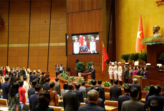 "Dưới cờ đỏ sao vàng thiêng liêng của Tổ quốc, trước Quốc hội và đồng bào, cử tri cả nước, tôi, Thủ tướng Chính phủ nước Cộng hòa xã hội chủ nghĩa Việt Nam xin tuyên thệ: Tuyệt đối trung thành với Tổ quốc, với nhân dân, với Hiến pháp nước Cộng hòa xã hội chủ nghĩa Việt Nam, nỗ lực phấn đấu, hoàn thành tốt nhiệm vụ được Đảng, Nhà nước và nhân dân giao phó", Thủ tướng Chính phủ Lê Minh Hưng tuyên thệ.