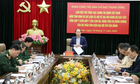 Tại Hội nghị, đồng chí Trung tướng Nguyễn Văn Đức, Cục trưởng Cục Tuyên huấn đã báo cáo với Đoàn công tác về công tác lãnh đạo, chỉ đạo, hướng dẫn nắm tình hình dư luận xã hội về đại hội đảng bộ các cấp trong Đảng bộ Quân đội; tổng hợp các ý kiến đóng góp vào dự thảo văn kiện trình Đại hội đại biểu toàn quốc lần thứ XIV của Đảng và chủ trương sắp xếp, tinh gọn bộ máy và thực hiện chính quyền địa phương 2 cấp. Theo đó, quán triệt, triển khai thực hiện Kế hoạch số 83-KH/BTGDVTW-BCĐ, ngày 13/6/2025 của Ban Chỉ đạo nắm tình hình Nhân dân và dư luận xã hội về đại hội đảng bộ các cấp; tổ chức lấy ý kiến và tổng hợp ý kiến góp ý của cán bộ, đảng viên và Nhân dân vào dự thảo các văn kiện trình Đại hội đại biểu toàn quốc lần thứ XIV của Đảng, Tổng cục Chính trị đã tích cực, chủ động tham mưu với Quân ủy Trung ương, Bộ Quốc phòng triển khai nhiều chủ trương, giải pháp lãnh đạo, chỉ đạo đồng bộ, toàn diện, có trọng tâm, trọng điểm, đạt kết quả tích cực.