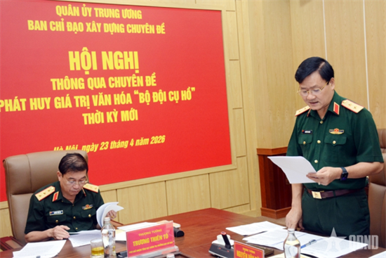 Sáng 23/4, tại Hà Nội, Ban Chỉ đạo xây dựng chuyên đề của Quân ủy Trung ương tổ chức Hội nghị thông qua chuyên đề "Phát huy giá trị văn hóa “Bộ đội Cụ Hồ” thời kỳ mới". Thượng tướng Trương Thiên Tô, Ủy viên Trung ương Đảng, Phó Chủ nhiệm Tổng cục Chính trị, Trưởng Ban Chỉ đạo xây dựng chuyên đề chủ trì hội nghị.
