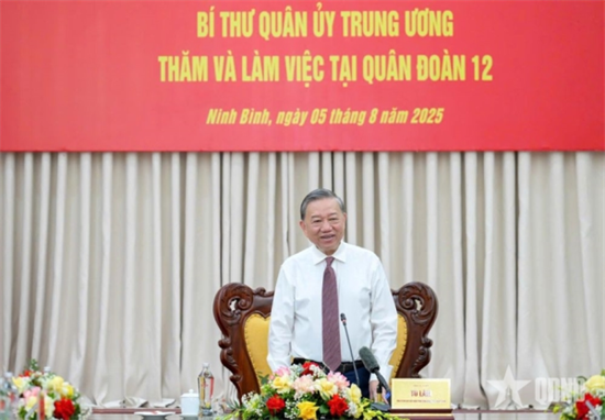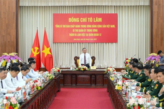 Phát biểu tại buổi làm việc, Tổng Bí thư Tô Lâm bày tỏ vui mừng khi đến thăm và làm việc với cán bộ, chiến sĩ Quân đoàn 12. Nhấn mạnh, việc Bộ Quốc phòng quyết định thành lập Quân đoàn 12, trên cơ sở bàn giao nguyên trạng các đơn vị thuộc Quân đoàn 1 và Quân đoàn 2, là chủ trương lớn, sự kiện có ý nghĩa rất quan trọng, đánh dấu sự trưởng thành, phát triển của Quân đội ta, là bước cụ thể hóa Nghị quyết Đại hội XIII của Đảng về nhiệm vụ xây dựng Quân đội.