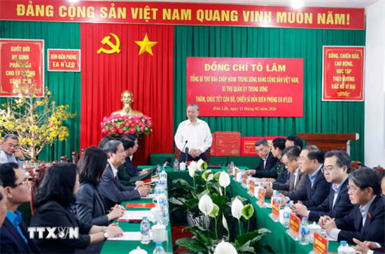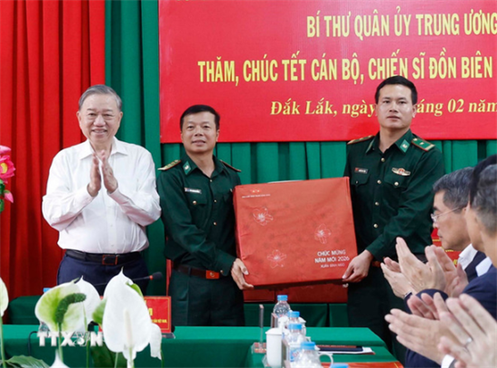 Chào mừng thành công Đại hội đại biểu toàn quốc lần thứ XIV của Đảng và chuẩn bị đón chào Xuân Bính Ngọ năm 2026, sáng 11/2, Tổng Bí thư Tô Lâm, Bí thư Quân ủy Trung ương thăm, chúc Tết cán bộ, chiến sĩ Đồn Biên phòng Ea H’Leo (tỉnh Đắk Lắk).