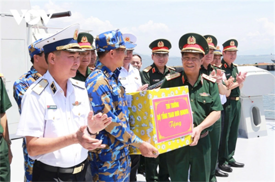 | 阮文义上将向参加海上阅兵活动的武装力量予以赠送礼物和支持鼓励(图片来源:vov.vn) |