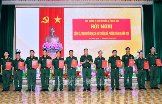| 金瓯省军事党委常务委员会举行仪式,宣布并颁发干部调动、任命决定,任命乡级军事指挥部指挥长。图自越通社 |