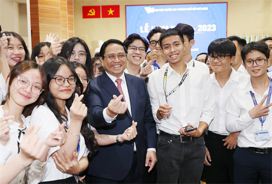 | 范明政总理与胡志明市国家大学学生合影。图自越通社 |